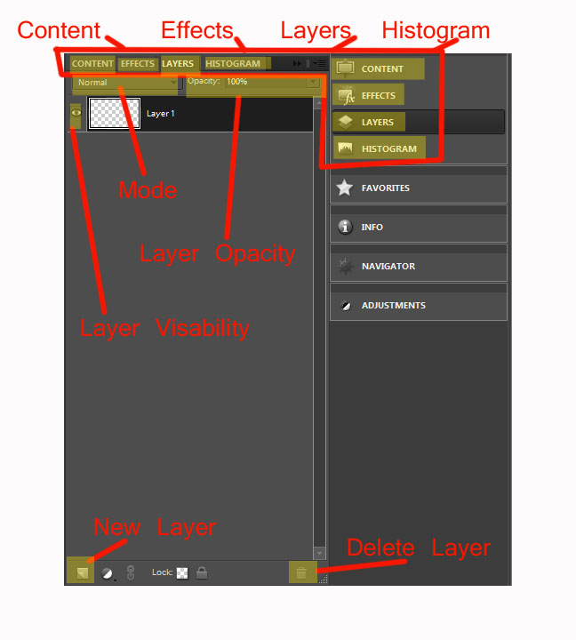 PHEW....... OK, now moving on to the LAYER BOX! This is your box that will show you you Actions, Filters, Histograms, Content extras, adjustments..but MOST important...your LAYERS! Working with layers is sooo important. It allows you to go back and make changes on any layer at anytime with out disrupting other layers, you can add and delete layers as well as change the opacity of single layers...it's beautiful! :) Here is what your layer box looks like when you have the LAYERS section picked. It also shows how you can get to the other sections to show your other options, Where to click to create a NEW LAYER, and where to click to DELETE a layer.